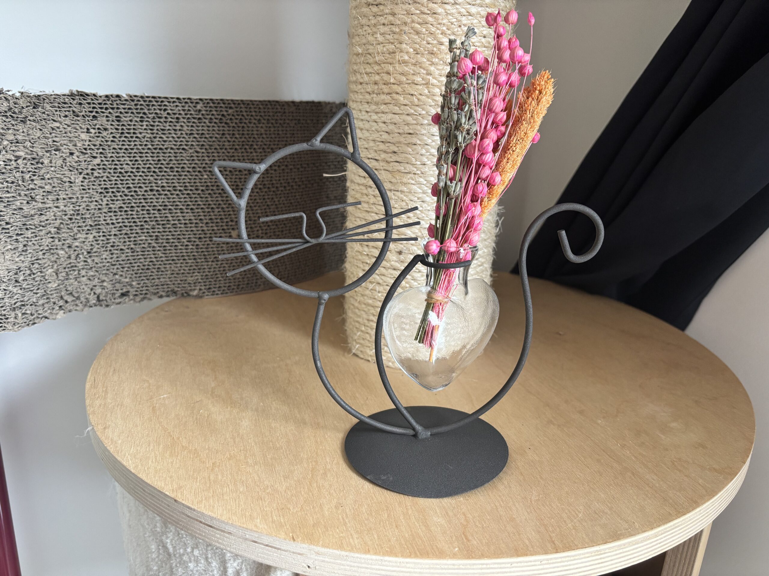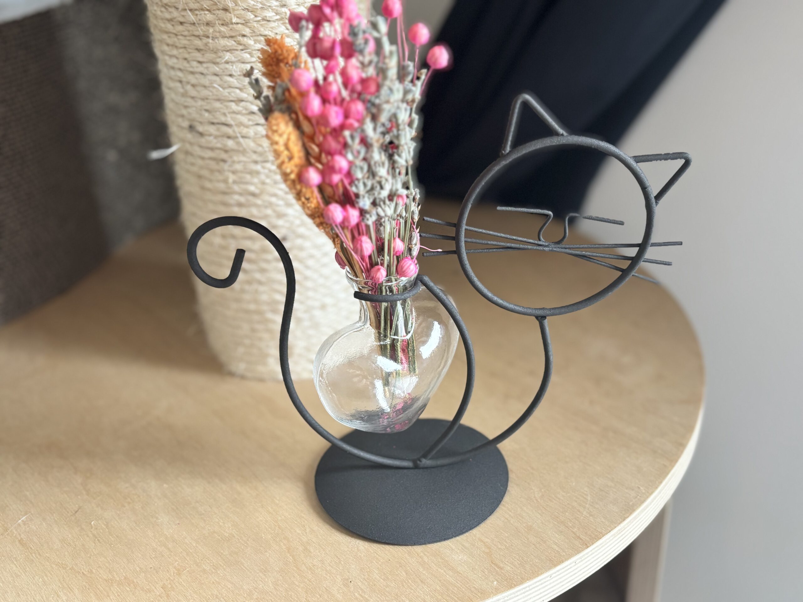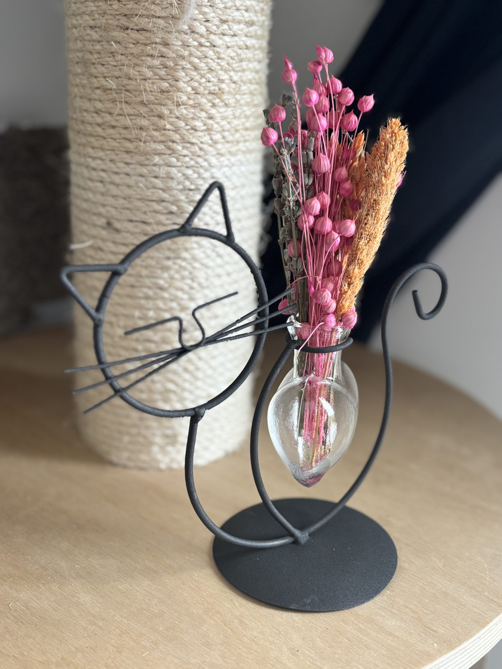 Leuke artistieke ijzeren kat met mini vaasje erbij voor een paar bloemen of droogbloemen.